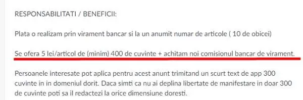 Pe lângă clasicul – “scrii cât vrei că doar cine suntem noi să-ți știrbim inspirația și avântul artistic, dar plătim cât vrem pentru că fuck you”, altceva e crema aici. Ce m-a amuzat cel mai tare a fost aroganța cu care acest stimat angajator a ținut să menționeze că plătește comisionul bancar.