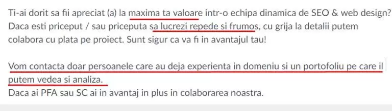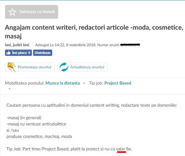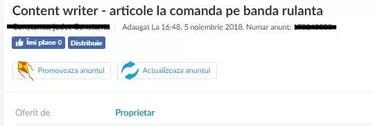 Dacă ești content writer sau freelance writer, te invit să-mi spui într-un comentariu care a fost cea mai mișto ofertă de muncă pe care ai primit-o și/sau care au fost cele mai horror anunțuri de recrutare din content writing peste care ai dat de-a lungul carierei tale.