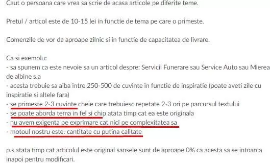 Poate, cu această ocazie, li se va face și lor rușine, iar content writerilor le va crește oleacă de coloană vertebrală ca să nu le mai accepte. Schimbarea pieței începe cu noi, zic, iar un prim pas este să-i luăm la mișto și apoi să plângem în paharul de cafea de 1 leu de la automat pentru că numai pe ăla ni-l permitem.