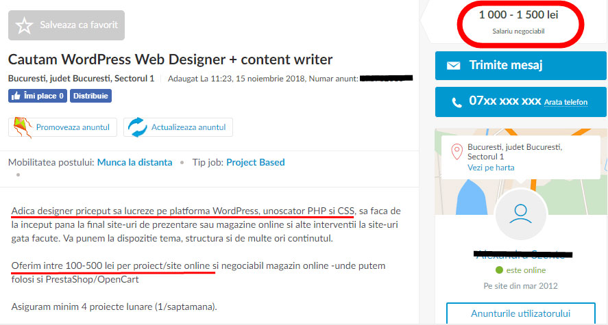 Cât tupeu să ai să postezi așa ceva? Eh, uite, cam atât. În mintea acestui stimat angajator, o ofertă situată între 1000 lei net (sub minimul pe economie, în prezent în cuantum de 1183 lei net, respectiv 1900 lei brut) și 1500 lei net este arhisuficientă pentru un cunoscător de web design, programare și oleacă de contenți cu portofoliu și experiență.