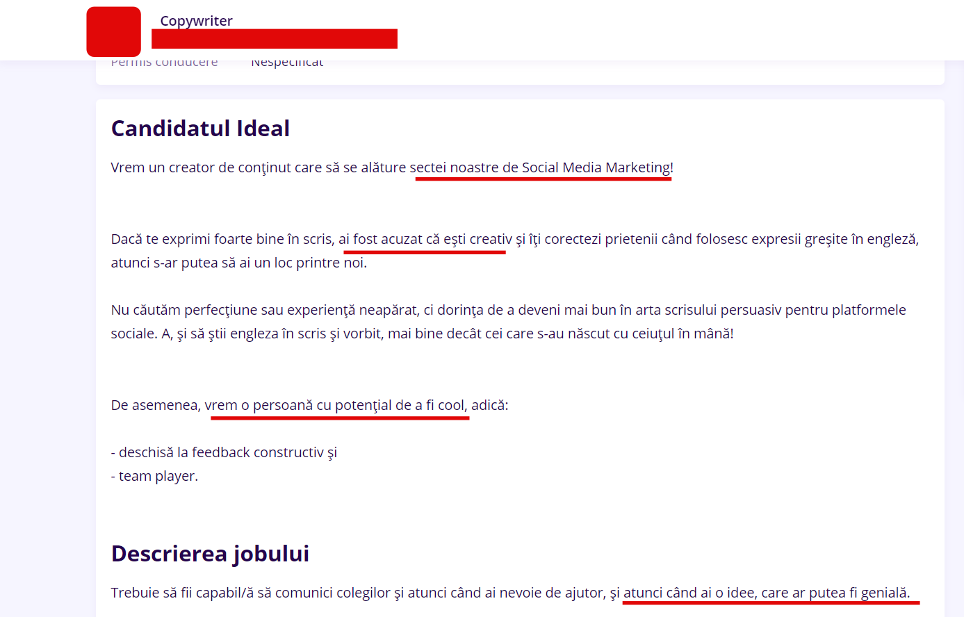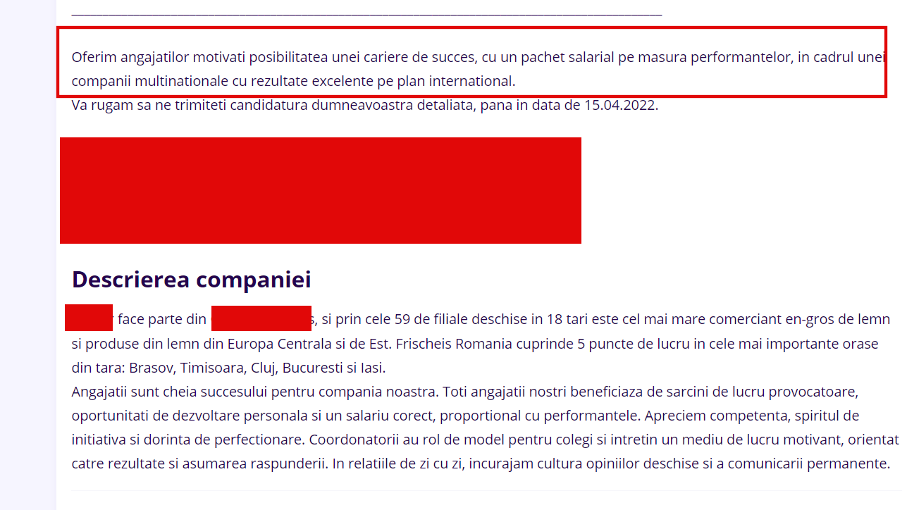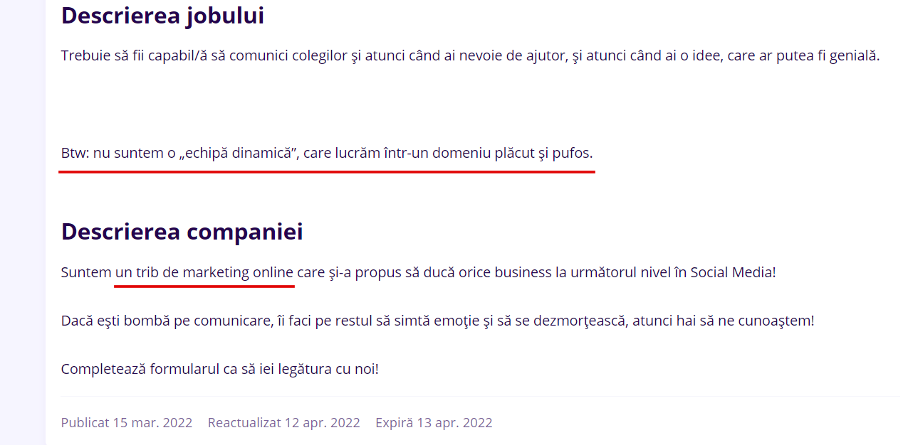 Doar nu credeați că am rămas fără material de analizat, nu-i așa? Din contră, ceea ce veți descoperi în rândurile următoare mi-a luat fix 5 minute să găsesc, pe cea mai cunoscută platformă de recrutare din România, ejobs.