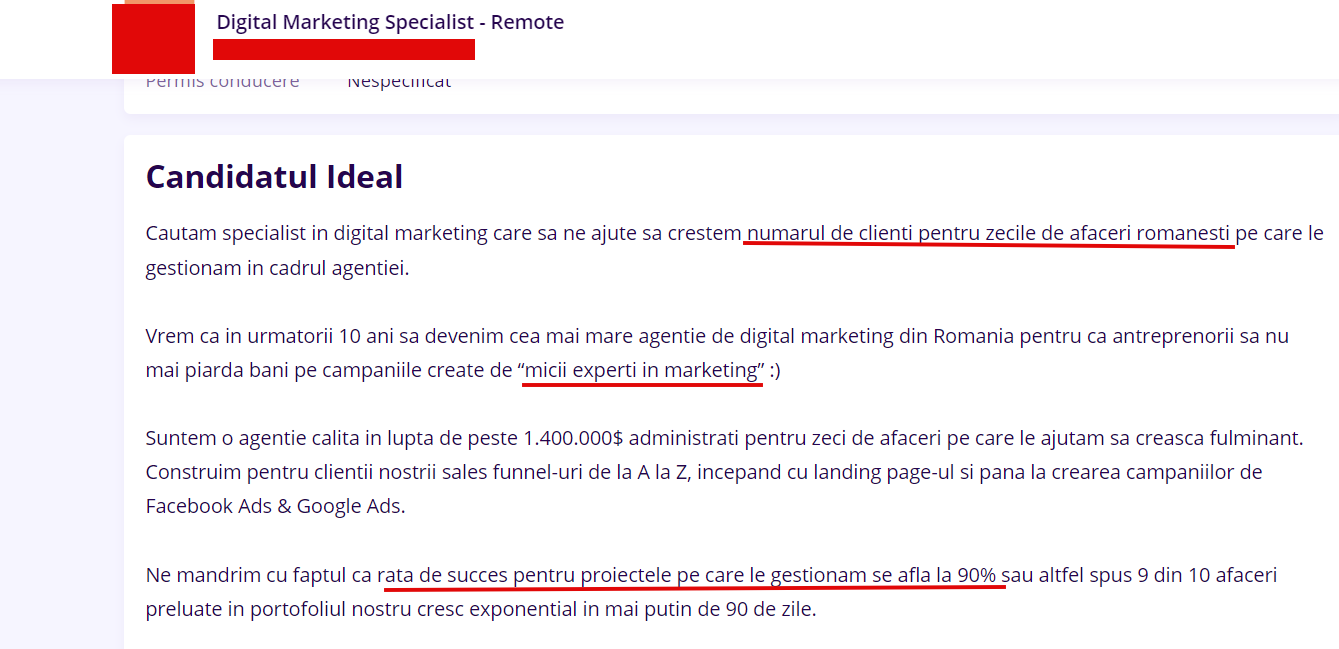 Următorii distinși angajatori ne vin direct din tărâmul buzzword-urilor, unde sălășluiesc sintagme acoperite de fix nimic, de exemplu "scalare", "zeci de afaceri", "cea mai mare agenție de digital marketing", "rată de succes de 90%".