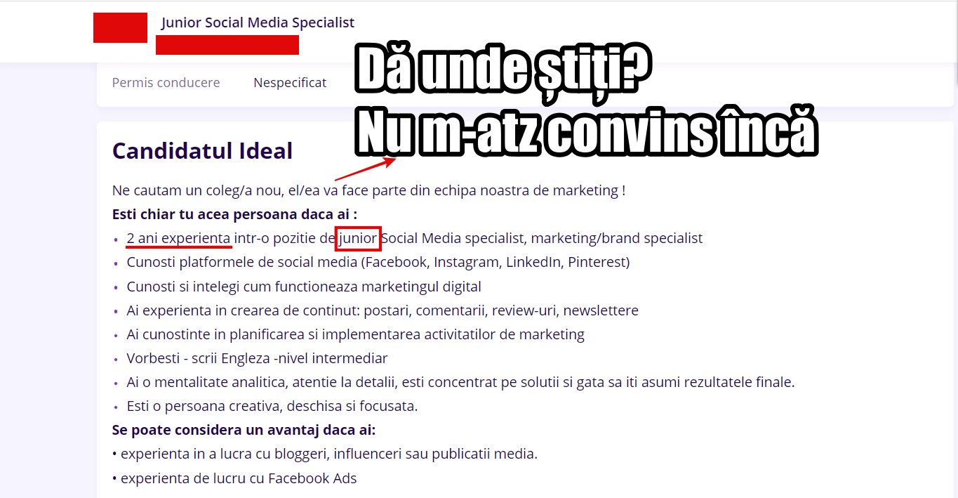 - “junior…cu 2 ani de experiență” – pentru că nu avem proprietatea termenilor și nici nu vrem să investim în angajați, doamne ferește, că poate ne pleacă la competiție. Nimeni nu mai e loial, dom'le, nimeni nu mai vrea să muncească în 2022, ia să angajez niște pakistanezi înfometați mai bine