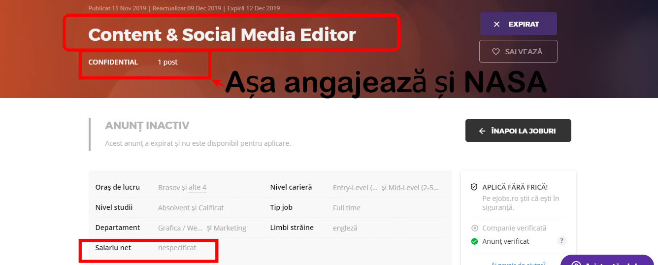 Și, în acest circ tragic-comic, avem exemple de analfabetism funcțional la toate nivelurile, inclusiv la stimatele companii care ar trebui să angajeze tinerii muncitori și liberi din România, și la stimații recrutori care ar trebui să-i atragă. Luați cu un Nurofen, de data aceasta…
