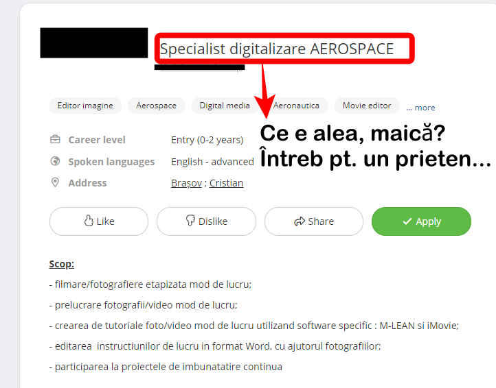 Fraților, nu știu de voi, dar eu mereu mi-am dorit provocări industriale. Cred că marketing-ul are alt gust între hale de beton și aeronave, îți gâdilă mai bine KPI-ul și Analytics-ul prinde aripi. Dacă am și „abilități în lucrul cu calculatorul”, mi se mai gâdilă și Google Translate-ul. Win-win. Luatz de aplicatz, dragi concetățeni, e locuri limitate în aeronavă.