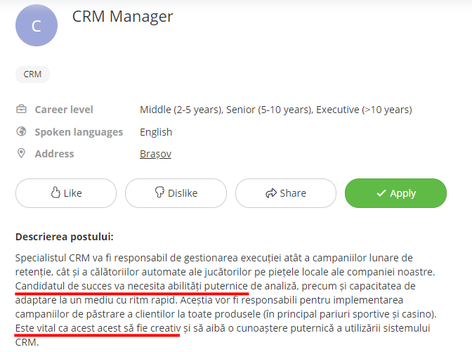 Numai mie îmi dă impresia acest anunț de recrutare că fu compus în Google Translate, între 4 beri și 2 shoturi? Candidatul “de succes” (pentru că e într-adevăr un succes personal să dai Apply la așa ceva), acest ACEST creativ al zilelor noastre trebuie să știe multe, stați așa că încă n-ați aflat nimic.
