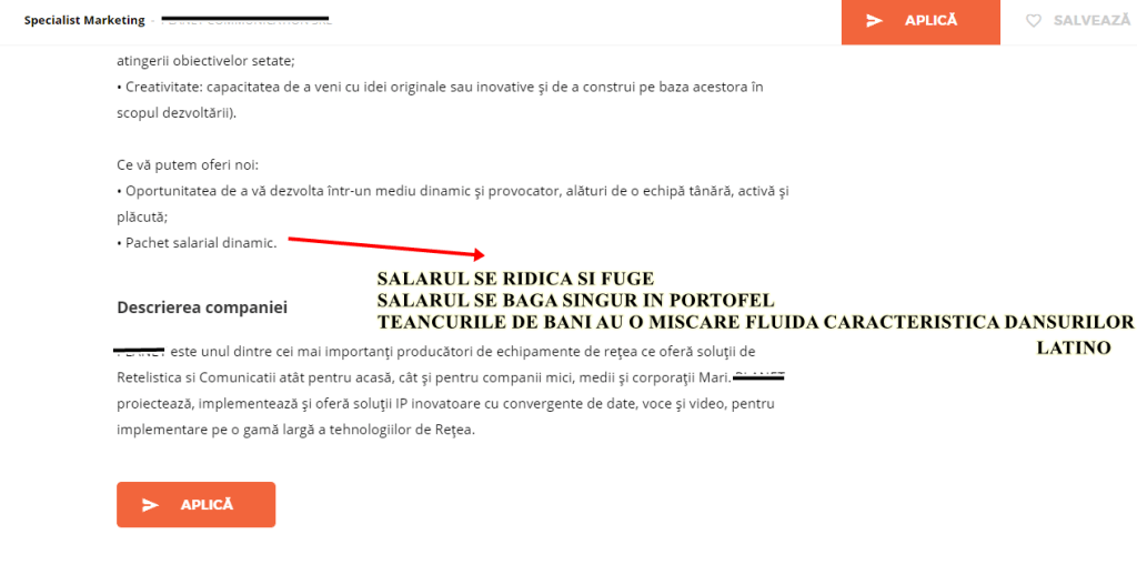 Acest angajator oferă unui specialist marketing un pachet salarial dinamic! Sunt foarte curioasă ce înseamnă asta. Eu am găsit câteva interpretări posibile dar aștept sugestii, poate n-am înțeles eu bine.