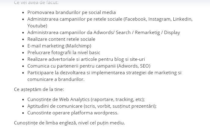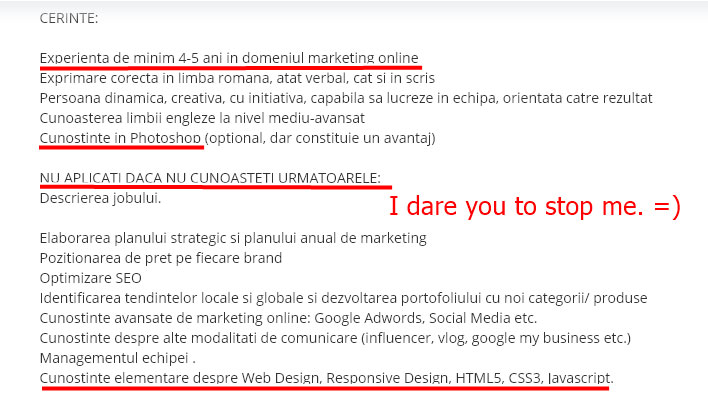 Pentru a fi candidatul potrivit pentru mirifica POZIȚIE (așa se zice acum, nu mă judecatz), trebuie să știm engleză ghini di tăt, să avem abilități de content writer, copywriter, digital marketer, social media manager, Google/Facebook Ads specialist, editare foto și, eventual, să transformăm apa în vin și vinul în apă...