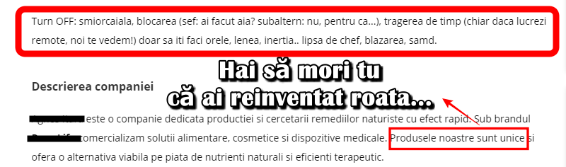 - "Turn off – smiorcăiala" – păi și voi ce-ați făcut tot anunțul ăsta? , "tragerea de timp" – de aici înțeleg că trebuie să cer bilet de voie ca să beau apă, mmkay, "chiar dacă lucrezi remote, noi te vedem" – nu zău, is that you, Big Brother? Ar trebui să mai adaug aici că un turn off pentru stimabilii este și blazarea, deși văd că lor le place maxim. În fond, nici măcar minimul absolut nu l-au putut îndeplini până acum – redactarea unui anunț de recrutare care să nu fie mai arogant decât Trump.