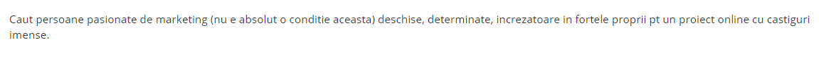 Câștiguri imense, da? Ați auzit? Ce contează numele companiei care de fapt e al unei persoane fizice? Cine are nevoie de pasiune pentru marketing? Astea sunt detalii. Încredere și determinare să fie. De aceea cu toții devenim multimilionari pentru că ne dorim asta. Așa mi-a zis mie nea Llorand - că bogăția e de fapt în mine dar mă identific prea mult cu a fi săracă și d-aia nu am bani.