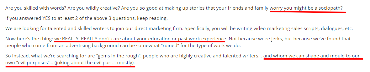 Nu numai că nu atrageți pe nimeni din content marketing, dar e problematic să vă lăudați că vreți un candidat sociopat. Nici ca glumă, personal, nu pot gusta așa ceva – totuși e un termen din psihologia clinică. Prea ne jucăm așa cu termeni serioși aruncați la plesneală – sunt trist, am depresie, sunt agitat, am anxietate. Așa și voi – inventez povești, sunt sociopat. Odată că, și dacă vreți să fiți simpatici, ați greșit înțelesul termenului. Sociopații se ocupă cu altele.