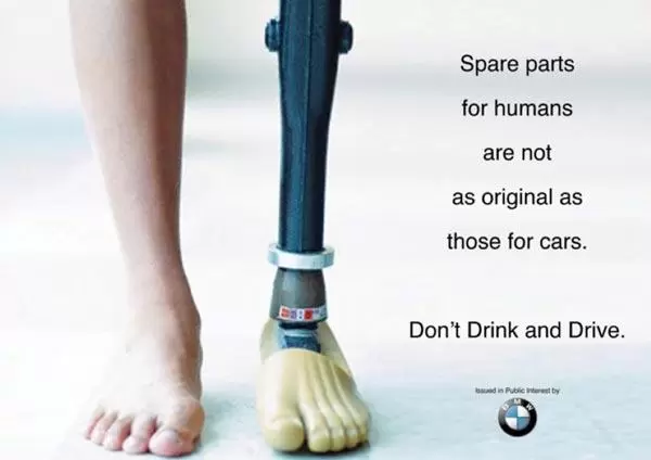 În acest print, scopul celor de la BMW a fost atragerea atenției asupra pericolelor consumului de băuturi alcoolice în timp ce conduci. Am ales acest exemplu pentru că mesajul este unul pe cât de macabru pe atât de adevărat. În plus, cei de la BMW au grijă să aleagă cuvinte cu care publicul țintă poate rezona foarte ușor si care creează rapid asocieri mentale în rândul conducătorilor auto (spare parts – piese de schimb).