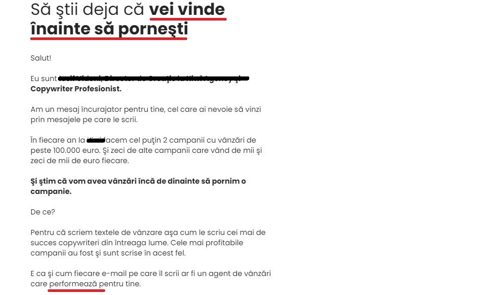 Nu este important din partea cui vin astfel de mesaje, ci doar că există și au puterea să le dea începătorilor o idee greșită despre copywriting - în ce constă, ce rezultate îți poate aduce și cât de repede.