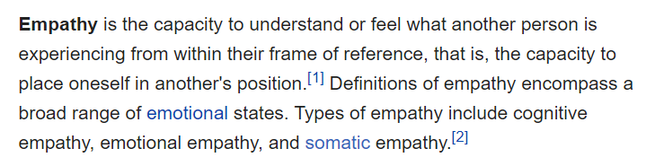 - Să înțelegi ce nevoi au cei pe care îi vei ajuta (empatie) – hai să începem prin a stabili că nu asta înseamnă empatia, vreți? Dacă tot folosiți termeni din psihologie, nu v-ar plăcea să-i și înțelegeți? V-am lăsat o definiție în limba engleză, o regăsiți mai jos...