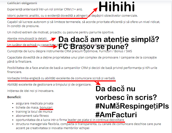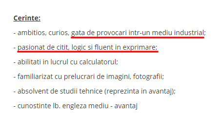 Și, în acest circ tragic-comic, avem exemple de analfabetism funcțional la toate nivelurile, inclusiv la stimatele companii care ar trebui să angajeze tinerii muncitori și liberi din România, și la stimații recrutori care ar trebui să-i atragă. Luați cu un Nurofen, de data aceasta…