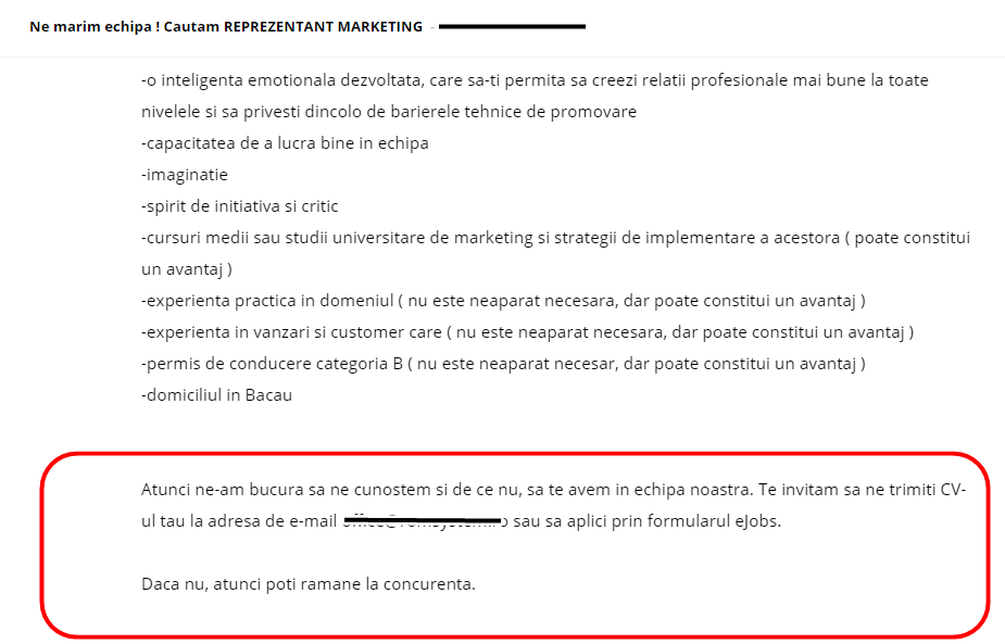 Nu doar atât, dar cerințele postului nu au absolut nicio treabă cu domeniul marketing-ului. De asemenea, nu sunt precise sau măsurabile. Cum măsori la interviu capacitatea cuiva de a lucra în echipă sau cu termene limită?