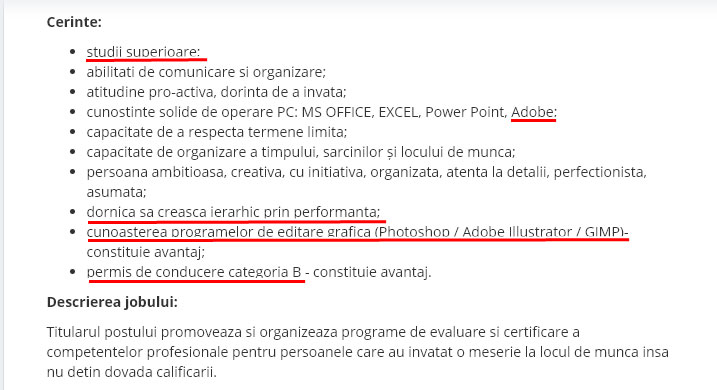 Pentru a fi candidatul potrivit pentru mirifica POZIȚIE (așa se zice acum, nu mă judecatz), trebuie să știm engleză ghini di tăt, să avem abilități de content writer, copywriter, digital marketer, social media manager, Google/Facebook Ads specialist, editare foto și, eventual, să transformăm apa în vin și vinul în apă...
