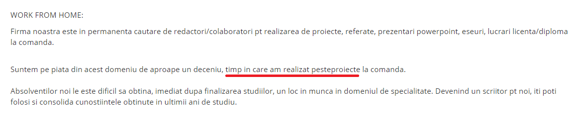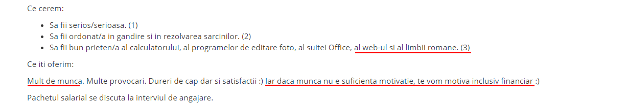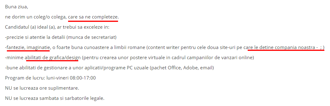 Sincer, nu vreau să mă pronunț în privința altor domenii – cititorii avizi ai acestui blog (toți cei 1, vă văd și vă apreciez) știu că anunțurile pe care le selectez vizează în genere domeniul publicitar și cele conexe acestuia - marketing, content writing și copywriting etc. Dar tocmai pentru că arunc multe priviri peste acest gen de anunțuri de recrutare mă ia urticaria – paradoxal, fix domeniile de la care ai pretenții, cele strâns legate de mass media și comunicare sunt cele care comunică cel mai prost. Ele ne aduc dăcât floricele, cerințe inepte, dezacorduri pentru că limba română e pentru plebe etc.