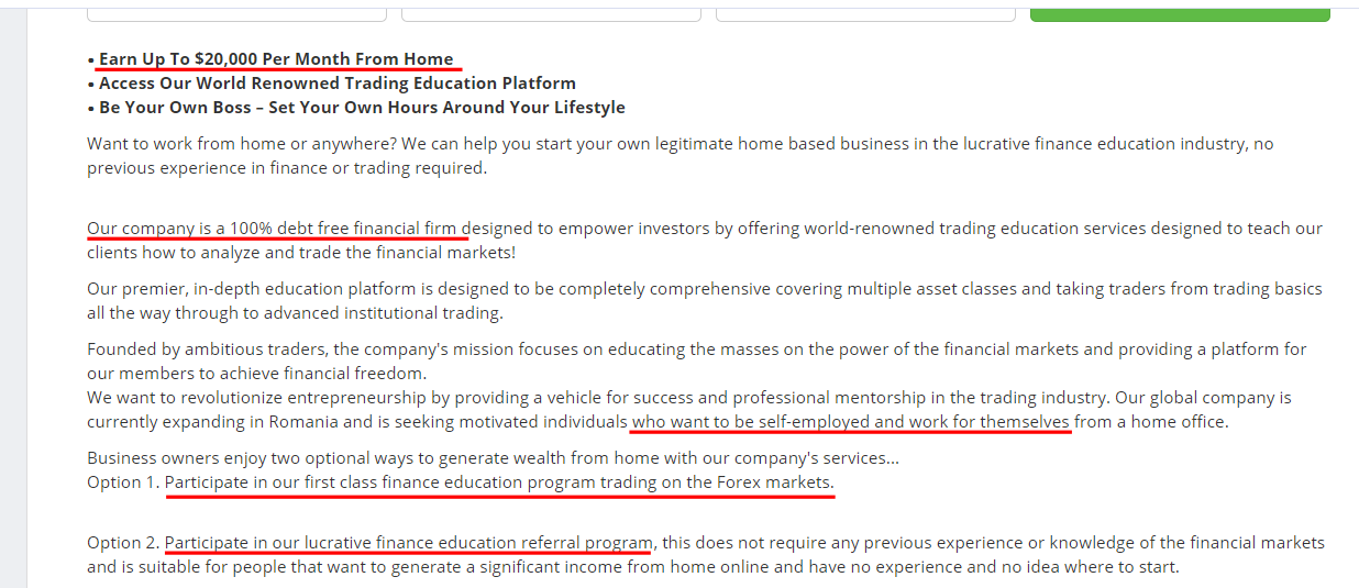 Spre final ne spun și ce avem de făcut – 1 – „participate in our first class finance education program” (adică vrem NOI bani de la TINE în prima fază ca apoi tu să ajungi bogat, cândva, nu știm când) și 2 – „participate in our lucrative finance education referral program” (adica dă-ne și nouă un comision pls).